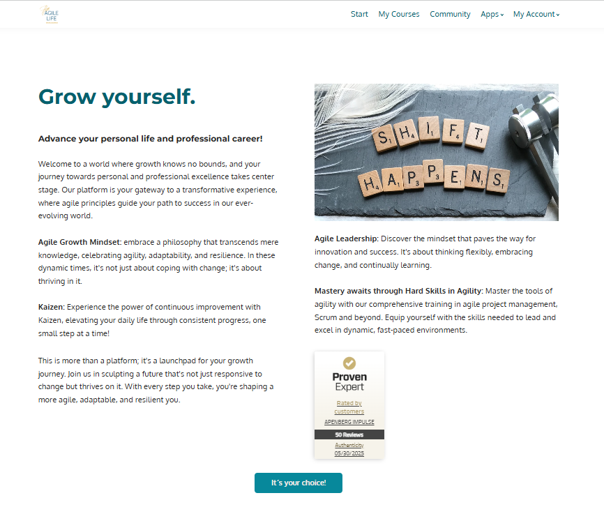 Während Apenberg Impulse den Fokus auf Führung und Organisationsentwicklung legt, bringt HELLOAGILELIFE:COM dieses Wissen in die Praxis – mit modernen Lernformaten, Zertifizierungsvorbereitungen und Coachings, die Theorie mit Alltagserfahrung verbinden.