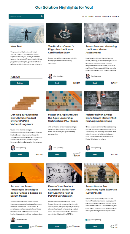 Hier findest du Vorbereitungskurse für Scrum.org-Zertifizierungen (PSM I–II, PSPO I–II, PAL I), Trainings zu Agile Leadership, agilem Mindset und Themen wie Kaizen, Resilienz und kontinuierlicher Verbesserung.